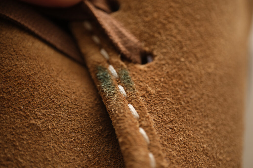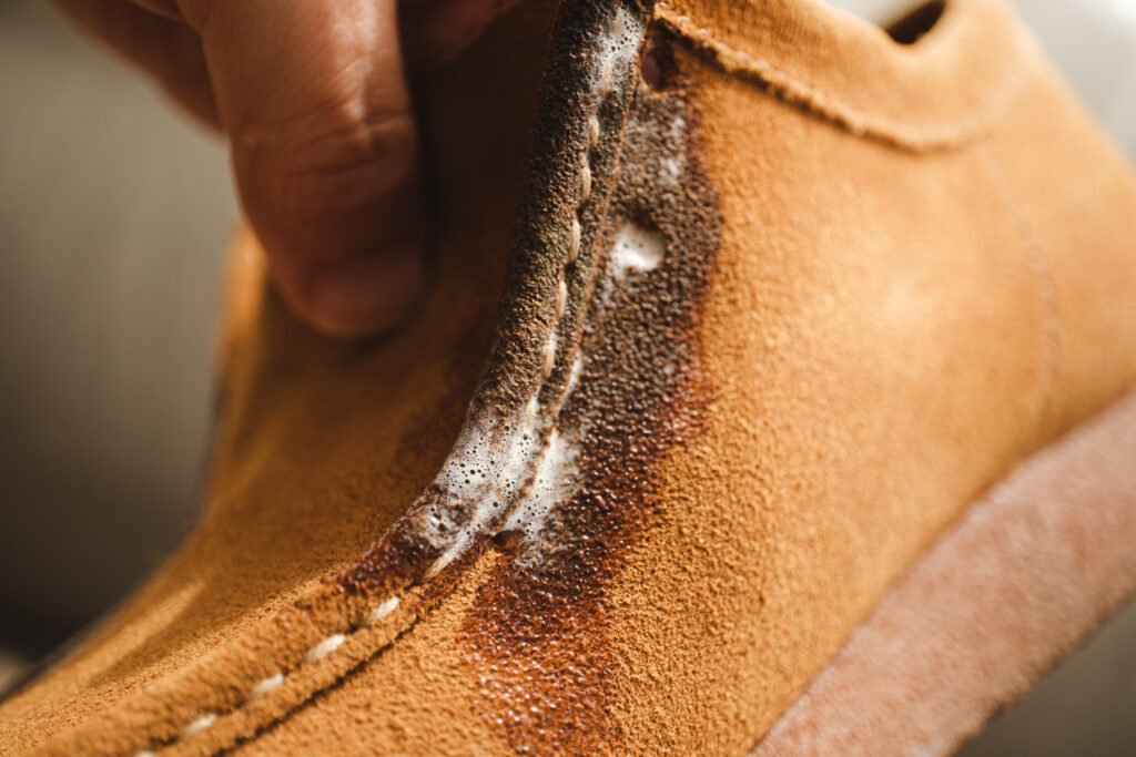 乾かして出来上がり。肉眼ではデニムの色は分からなくなりました。やるじゃん。ブルースティック。石けんで洗うということは多少なりともスエードの褪色につながりますし、乾燥で革が傷まないようにスエード用の保湿スプレーで仕上げることをオススメします。